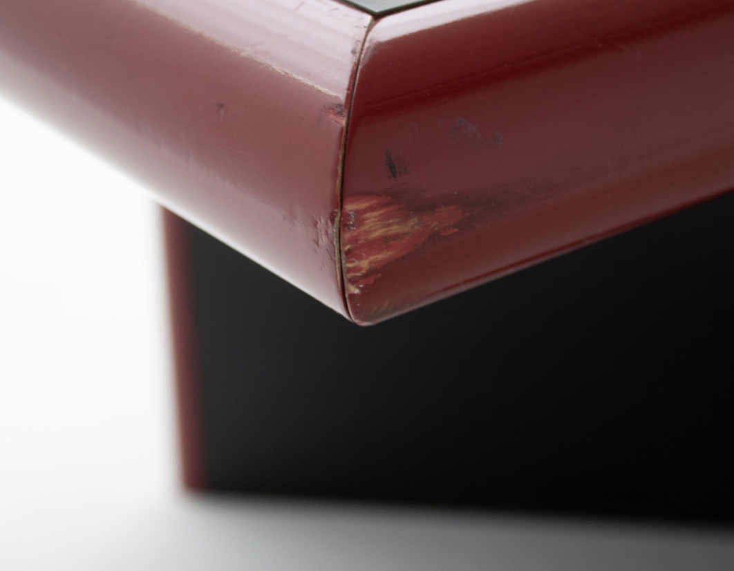 The glossy black lacquered top creates a mirror-like surface that plays with light, framed by a vivid red lacquer trim — a nod to Sabot’s daring, modernist vision.